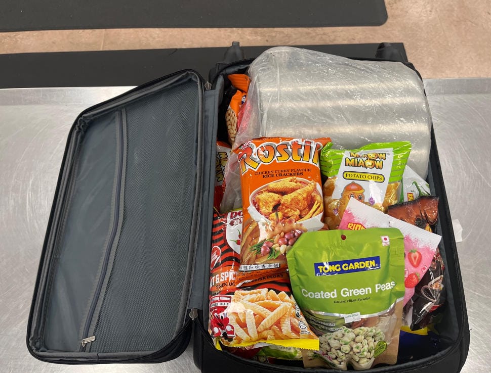海关人员对其行李进行检查,发现其中有锅具、食品及其他个人物品。