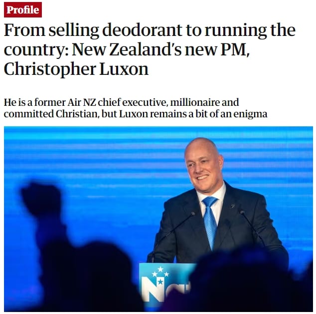 Luxon回答说:“嗯,我已经预料到了,我从踏入政坛第一天就说过,我爸妈16岁就没再念书了,我靠自己努力上了大学,取得了世俗意义上的成功,我踏入政坛是我想回馈新西兰社会。