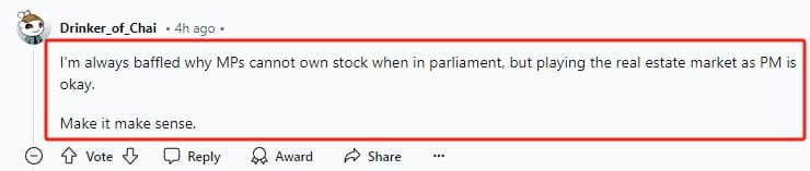 “我总是很疑惑,为啥国会议员不能持股,但总理就可以参与房地产市场。”