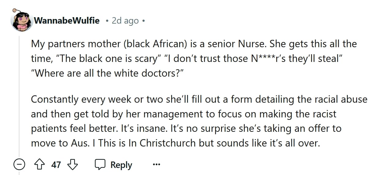 “每隔一两周,她就会填写一份表格,详细描述种族辱骂的情况,然后她的管理层就会告诉她,要努力让那些有种族歧视的病人感觉好一些。这太疯狂了。后来她接受offer搬到澳大利亚也就不足为奇了。坐标基督城,这一切总算都结束了。”