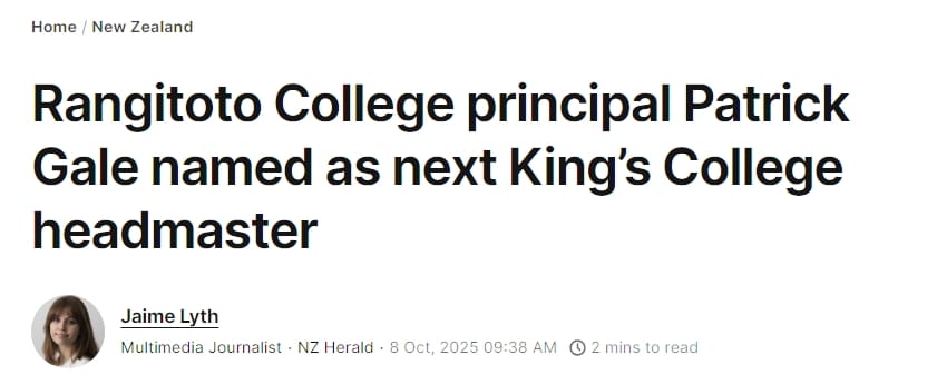 家长注意:奥克兰北岸知名公立高中Rangitoto College校长Patrick Gale宣布将在年底离开学校。