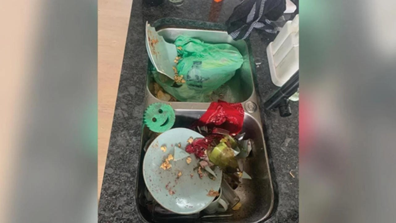 厨房水槽中堆满破碎的碗盘、垃圾袋,还有一条红色头巾。