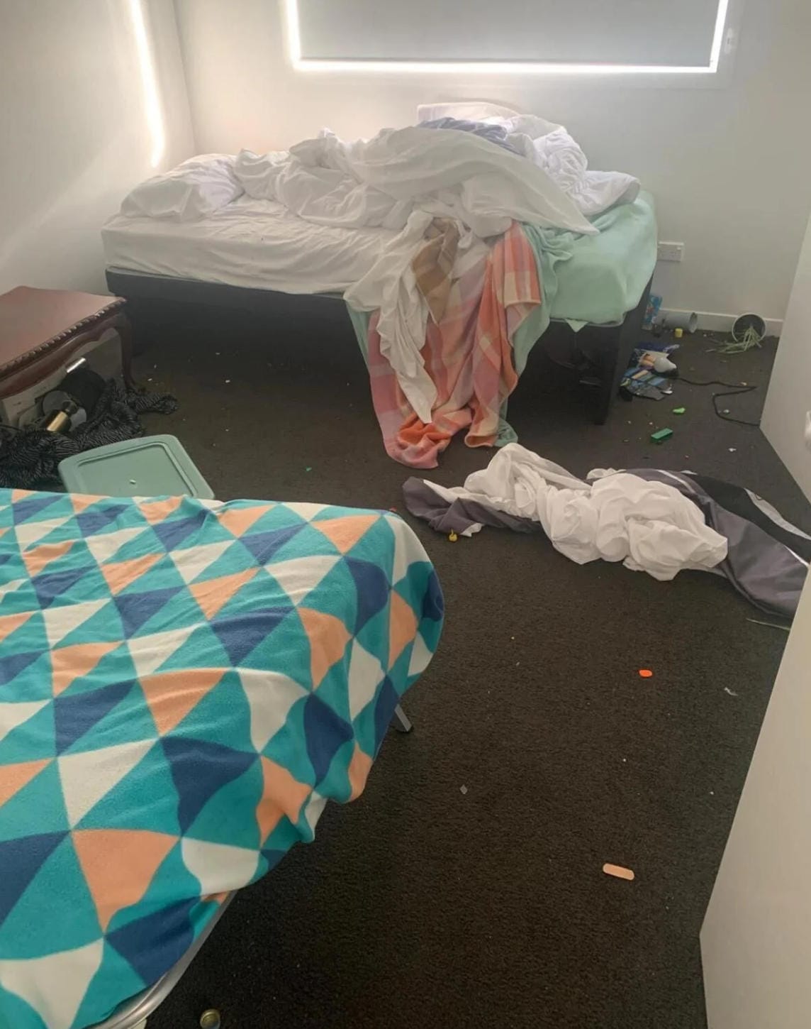 她补充说,家中每张床都被人睡过,其中一张上满是呕吐物。