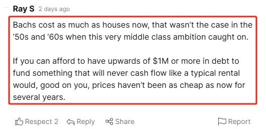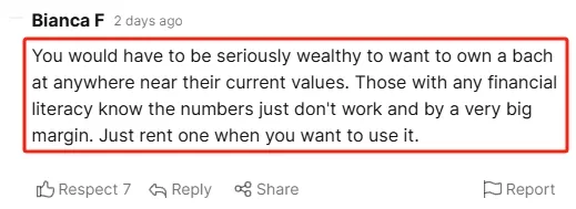 “现在度假屋的价格已经和普通住宅一样了,但在上世纪50/60年代,这种‘中产阶级梦’刚开始流行时,情况就大不一样。但要是你能负担上百万纽币债务来买一套永远无法像普通出租屋那样产生稳定现金流的房产的话,那就恭喜你吧,毕竟现在度假屋的价格是近年来的最低水平了。”