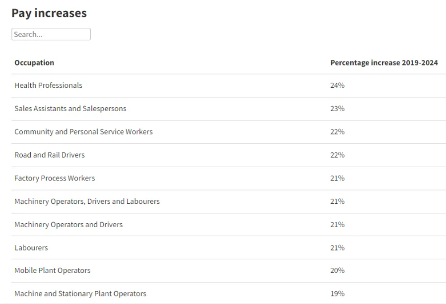 新西兰统计局统计了2019年到2024年各行业从业人员的工资上涨幅度。