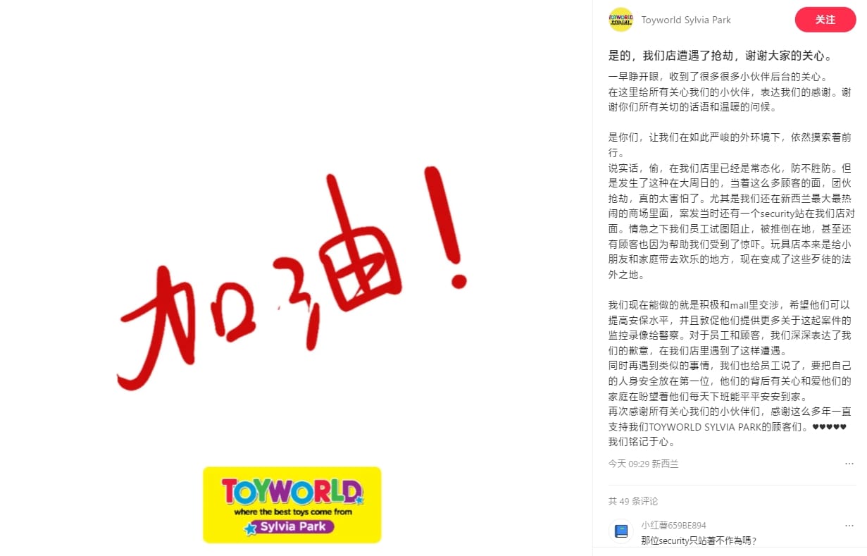 事发当晚,Toyworld Sylvia Park店也在小红书上也发布了报平安的帖子,感谢大家关心。