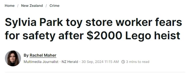 https://www.nzherald.co.nz/nz/crime/sylvia-park-toy-store-worker-fears-for-safety-after-2000-lego-heist/GBND3CYSSJGU5IU3LQXY5V7ZCE/?utm_medium=Social&utm_campaign=nzh_fb&utm_source=Facebook&fbclid=IwY2xjawFm2U5leHRuA2FlbQIxMAABHVDeeQzeX3qFRPv49y1J6TudX0Y8RHwrku-M7Mv7lW68hHzeN0x9KW9z8g_aem__GRuCQKedoivAAYolWeILA#Echobox=1727649453