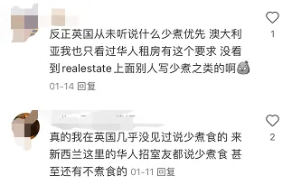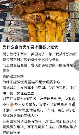 住在英国的华人表示,确实很少遇到“少煮食”的要求,但是在澳洲、新西兰就有看到过。的确有网友在澳大利亚租房,遇到了很多“少煮”的房子,在网上吐槽。“反正看到少煮两个字的房子我不会再租。”