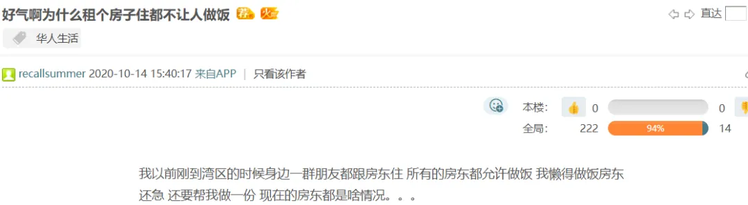美国的华人租客,也有同样的困扰。“好气啊,为什么租个房子都不让人做饭?!”