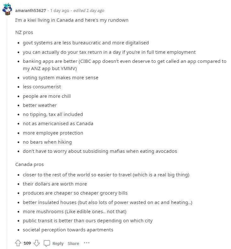 另一个居住在加拿大的新西兰人直接列出了对比清单:
