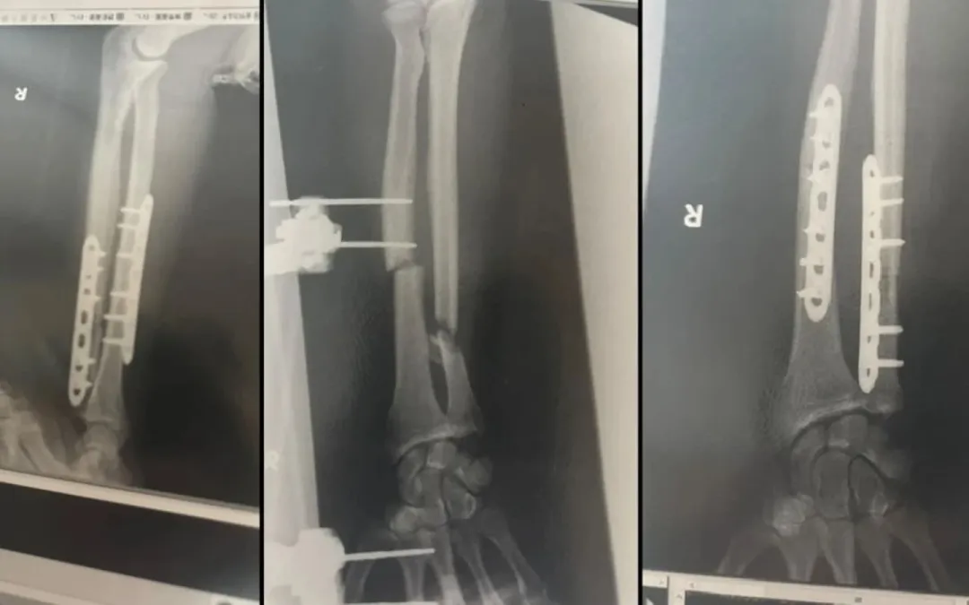 现在,他的手臂里有两块金属钢板,每天有4名护士轮流照顾。