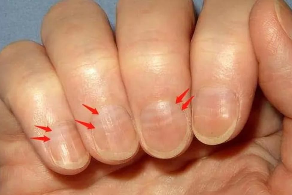 米氏线(Mees线)是一种横跨指甲的白色条纹,通常为乳白色或淡白色,出现在指甲的角质层下方。它的特点是:贯穿整个指甲,不随压力消失,随着指甲逐渐生长,米氏线也会逐渐向指尖移动。