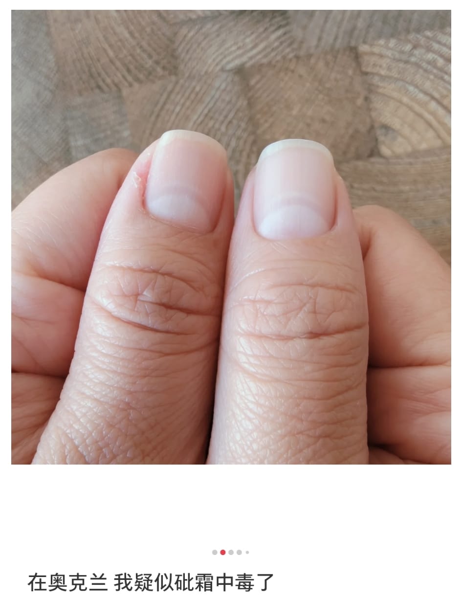 有华人网友自称自己疑似已中毒,还晒出了指甲上的“米氏线”。