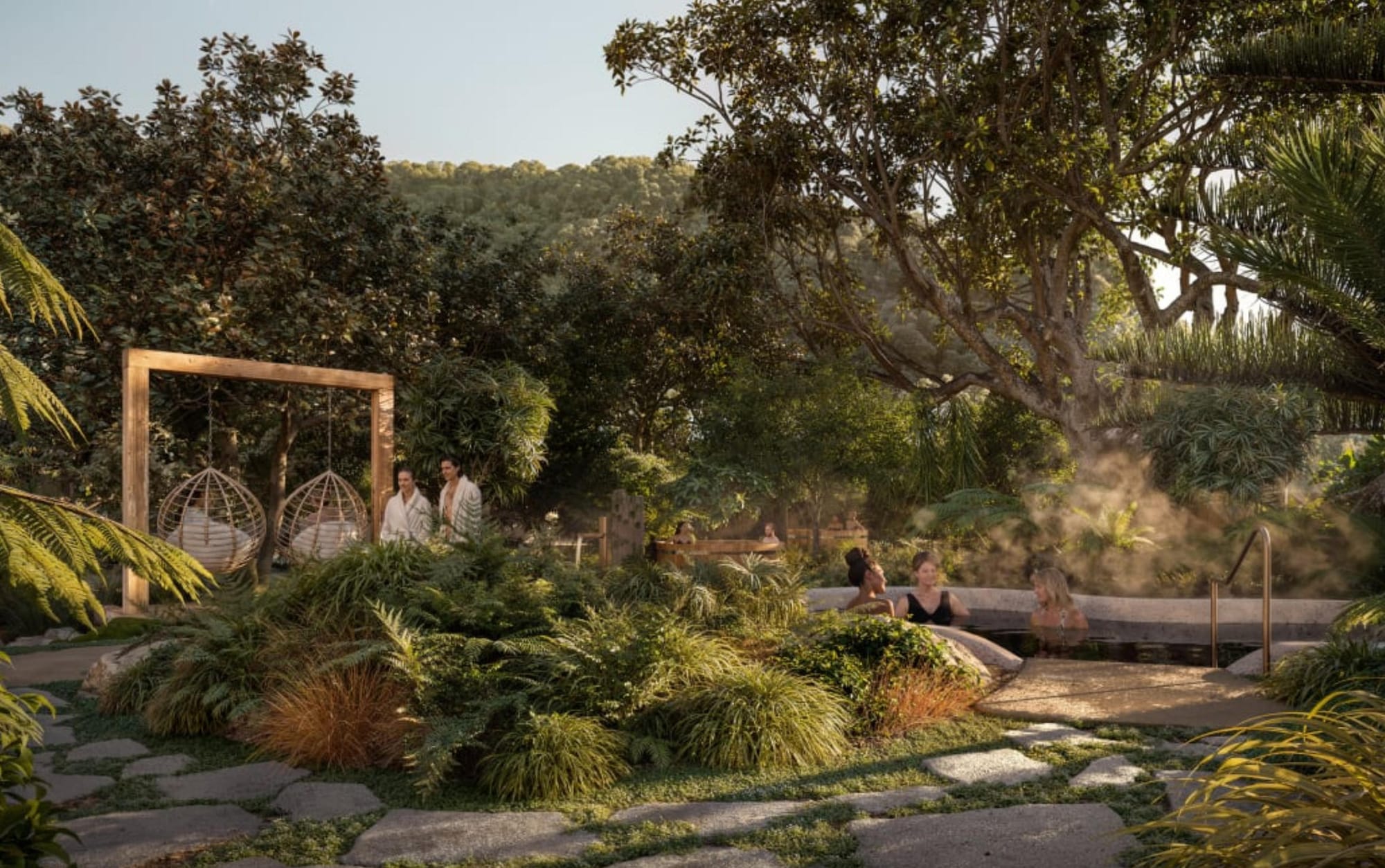 新温泉园区将与周围景观自然融合,包含温泉池、桑拿、疗愈步道、花园及亭台等多种户外空间。