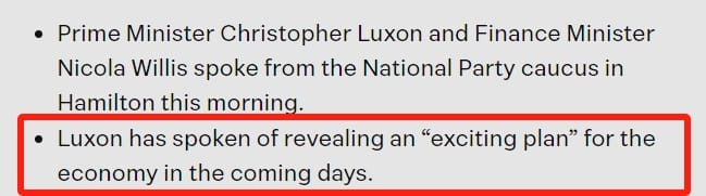 Luxon表示,不久会公布一个“激动人心的经济计划”。