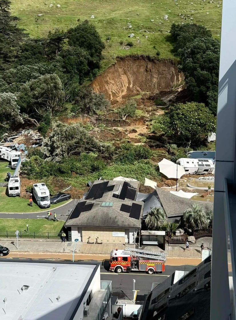 今天上午10时左右,滑坡产生的土方从倾泻而下,直接冲向位于下方的Mount Maunganui Beachside Holiday Park。