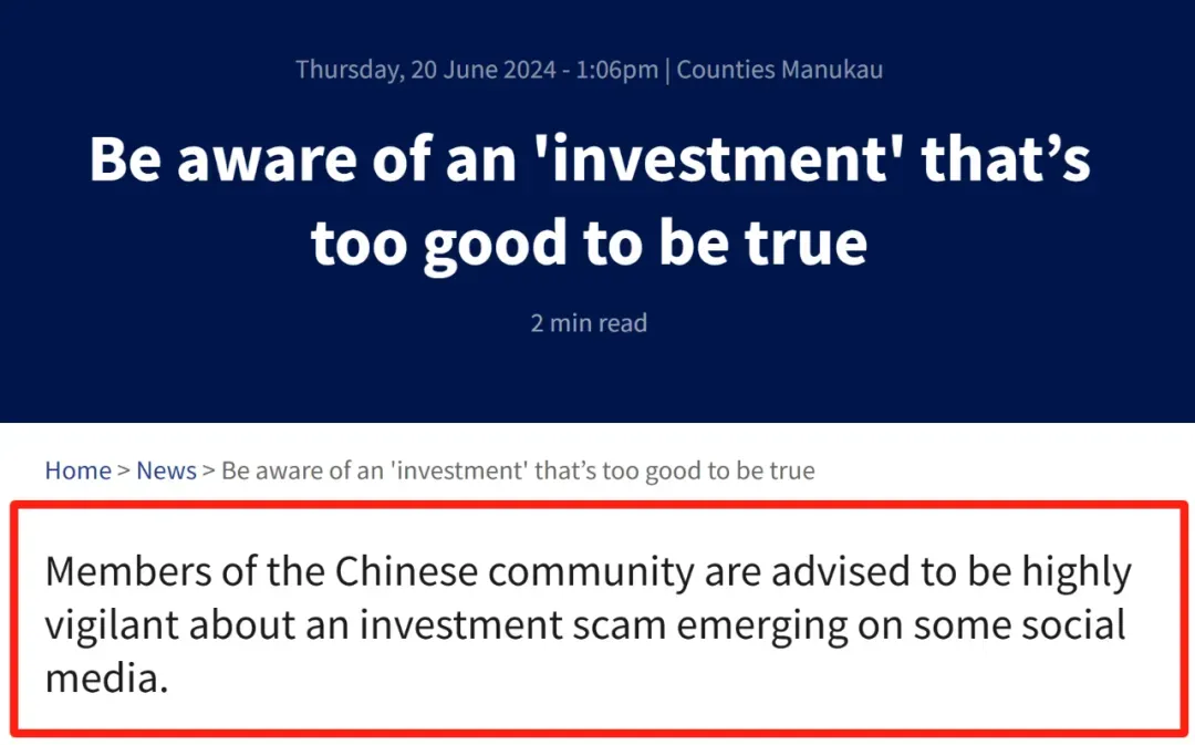 上个月,新西兰警方也专门提醒华人社区,谨防近期出现的新型投资骗局。