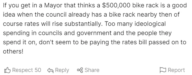 “如果一个市长觉得花50万纽币修一个自行车架是个好主意,尤其是旁边已经有自行车架的情况下,地税飞涨并不令人意外。市议会浪费了太多钱搞意识形态,然后将代价转给其他人。”