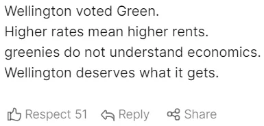 “惠灵顿人自己投了绿党,他们根本不懂经济。高地税意味着高房租,走到这一步是他们自找的。”