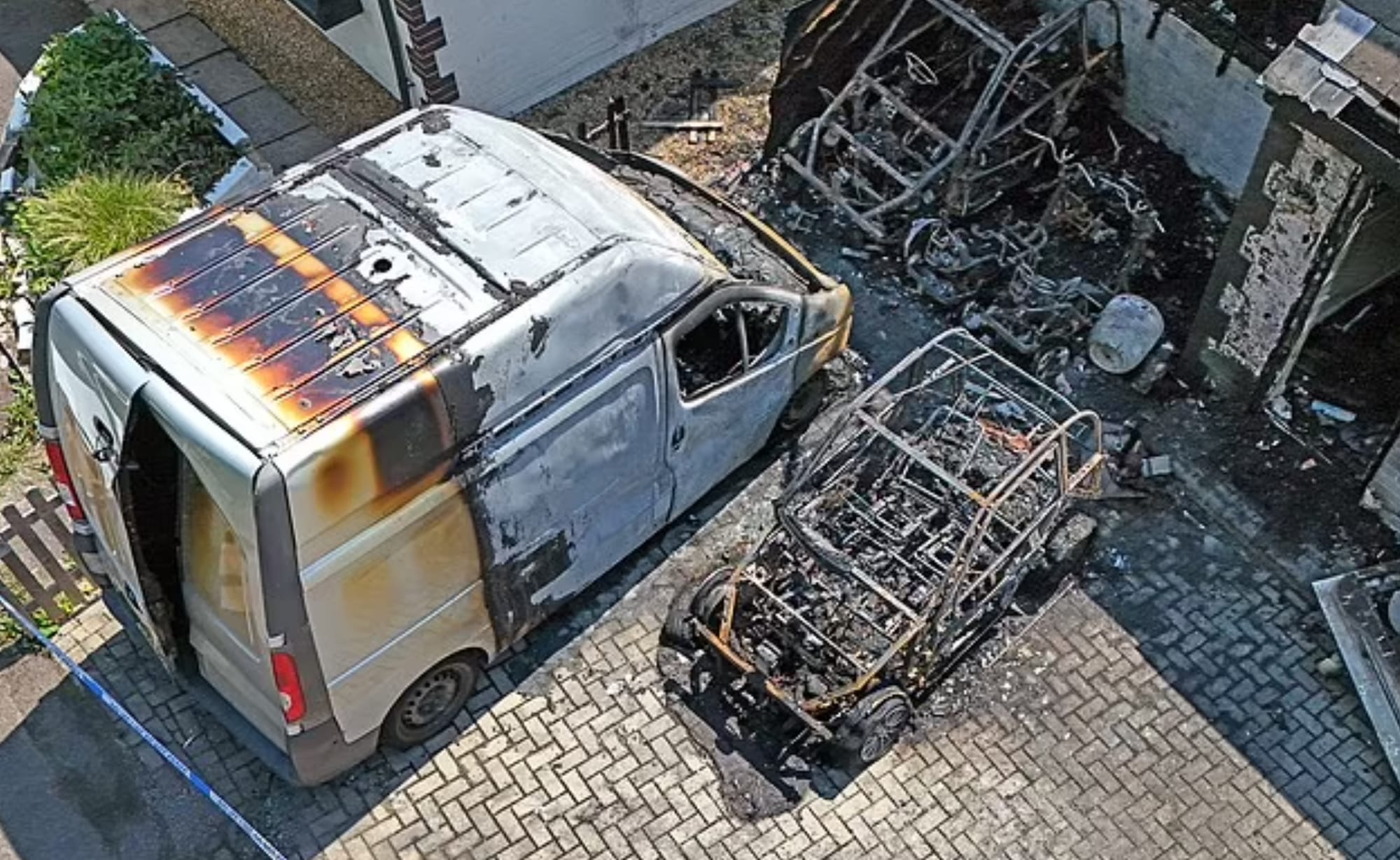 类似电动车着火事件现在不少见,国外也时常发生。上个月,英国发生一起被监控全程拍到,也是烧坏了其他车辆和房屋:
