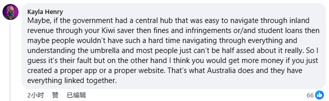 “也许吧,如果政府能弄个统一的平台,让大家能通过税务局账号或者KiwiSaver账号轻松查到自己的罚款、欠款、学生贷款之类的,那大家就不会觉得这么麻烦、这么难理清楚了。说到底很多人也就是懒得搞这些事。”