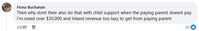 “那为什么他们不把这种系统也用在抚养费上呢?我这边被欠了三万多纽币的抚养费,结果税务局就是懒得去找该付钱的那方要。”
